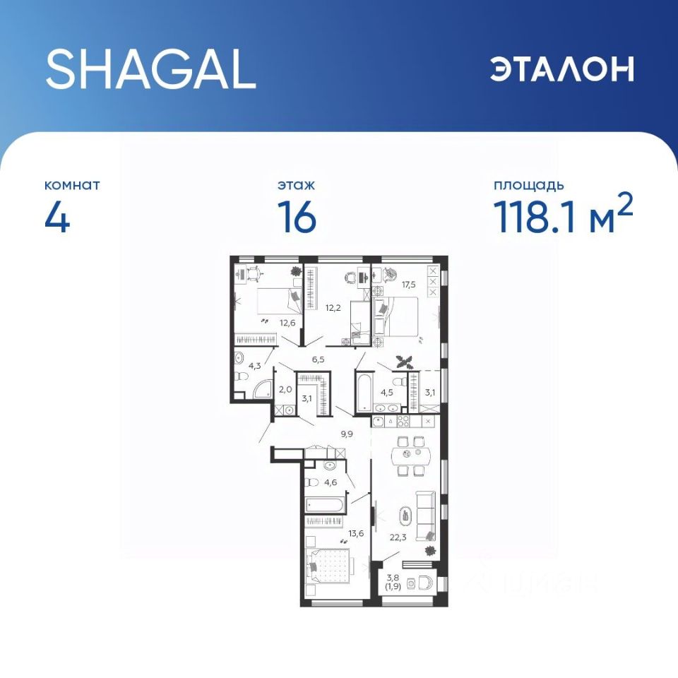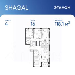 Продается квартира 158, по адресу г. Москва, внутригородская территория муниципальный округ Даниловский, ул. Петра Кончаловского, земельный участок 7, корпус Жилой квартал Shagal, 2 очередь, 6 этап, корпус 2 в Shagal на 16 этаже, с площадью 118.1 м2.
