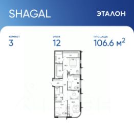 Продается квартира 411, по адресу Москва, внутригородская территория, муниципальный округ Даниловский, набережная Марка Шагала, земельный участок 15, корпус Жилой квартал Shagal, 2 очередь, 1 этап, корпус 7 в Shagal на 12 этаже, с площадью 106.6 м2.