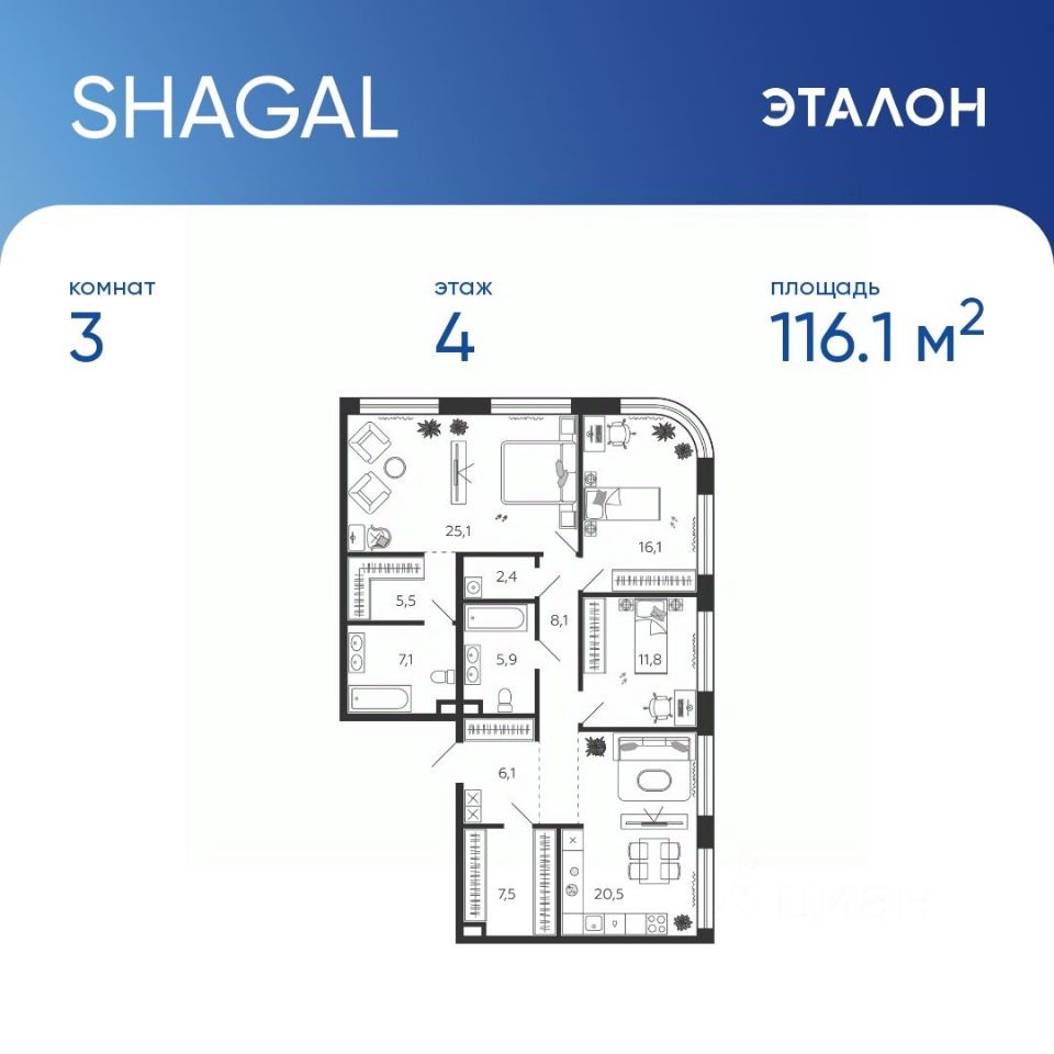 Продается квартира 313, по адресу Москва, внутригородская территория, муниципальный округ Даниловский, набережная Марка Шагала, земельный участок 15, корпус Жилой квартал Shagal, 2 очередь, 2 этап, корпус 3 в Shagal на 4 этаже, с площадью 116.1 м2.