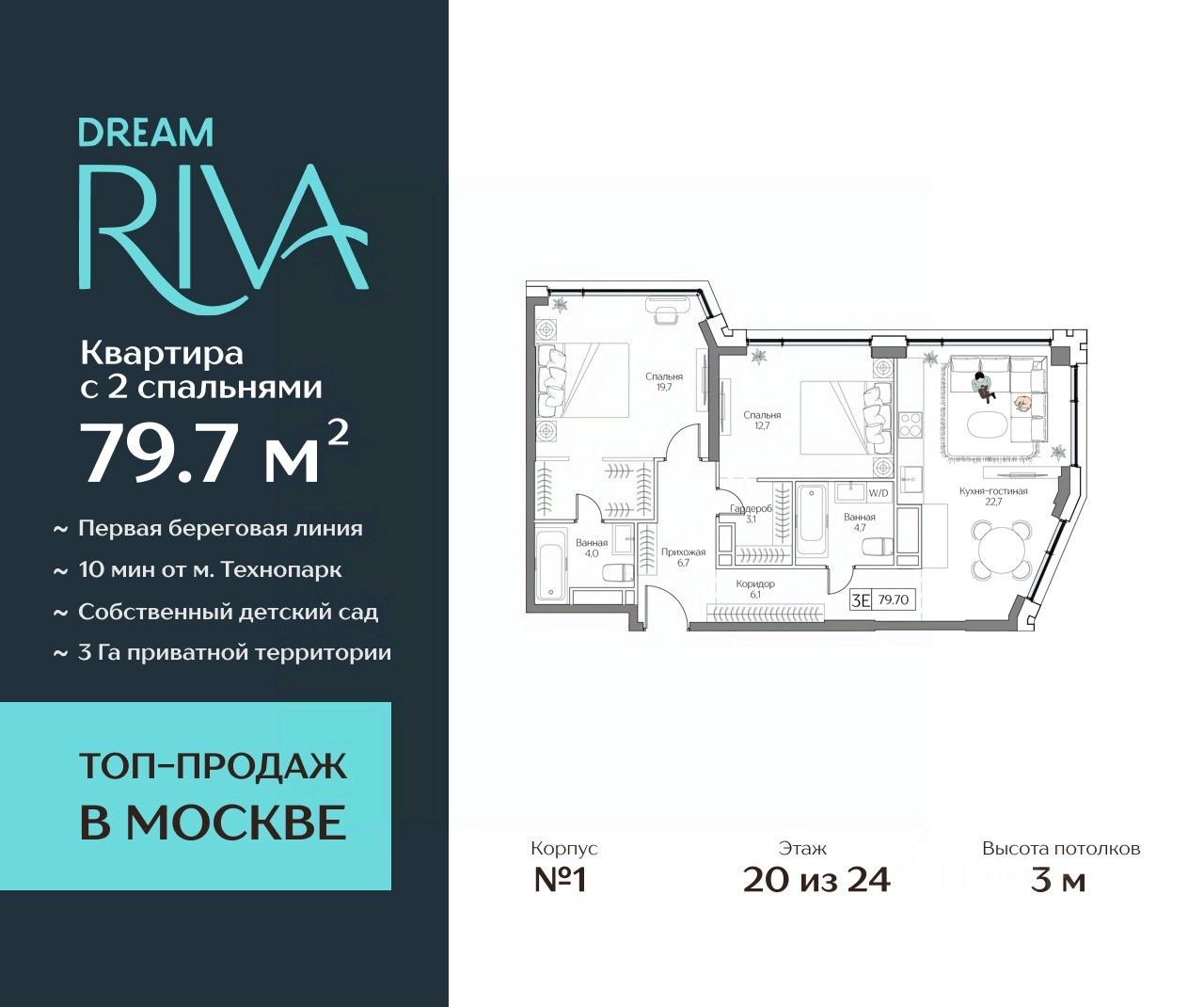 Продаётся Квартира с 2 спальнями квартира на 20 этаже 24-этажного дома (1 корпус).