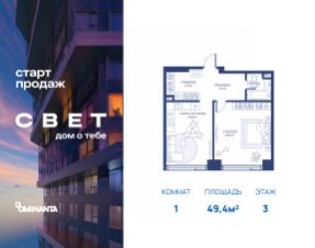 Продаётся 1-к квартира 49.4 кв.м. на 3-м этаже 51 этажного дома.