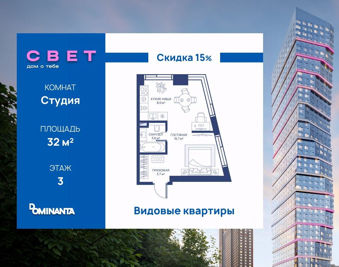 Жилой комплекс "СВЕТ" — воплощение современного комфорта и архитектурного изящества, созданное девелопером Dominanta в сотрудничестве с известным бюро СПИЧ. Комплекс представляет собой элегантное 52-этажное здание, расположенное в Западном Дегунино, на Дмитровском шоссе, 83А. Удачное местоположение обеспечивает удобство для жителей: станция метро "Селигерская" находится в пешей доступности, что делает путь в центр Москвы быстрым и комфортным.