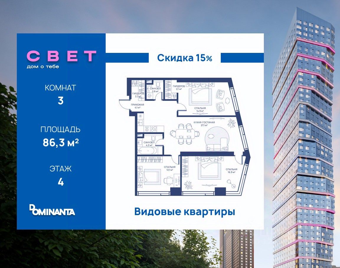 Жилой комплекс "СВЕТ" — воплощение современного комфорта и архитектурного изящества, созданное девелопером Dominanta в сотрудничестве с известным бюро СПИЧ. Комплекс представляет собой элегантное 52-этажное здание, расположенное в Западном Дегунино, на Дмитровском шоссе, 83А. Удачное местоположение обеспечивает удобство для жителей: станция метро "Селигерская" находится в пешей доступности, что делает путь в центр Москвы быстрым и комфортным.