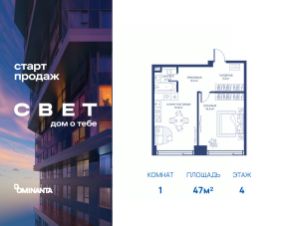 Продаётся 1-к квартира 47 кв.м. на 4-м этаже 51 этажного дома.