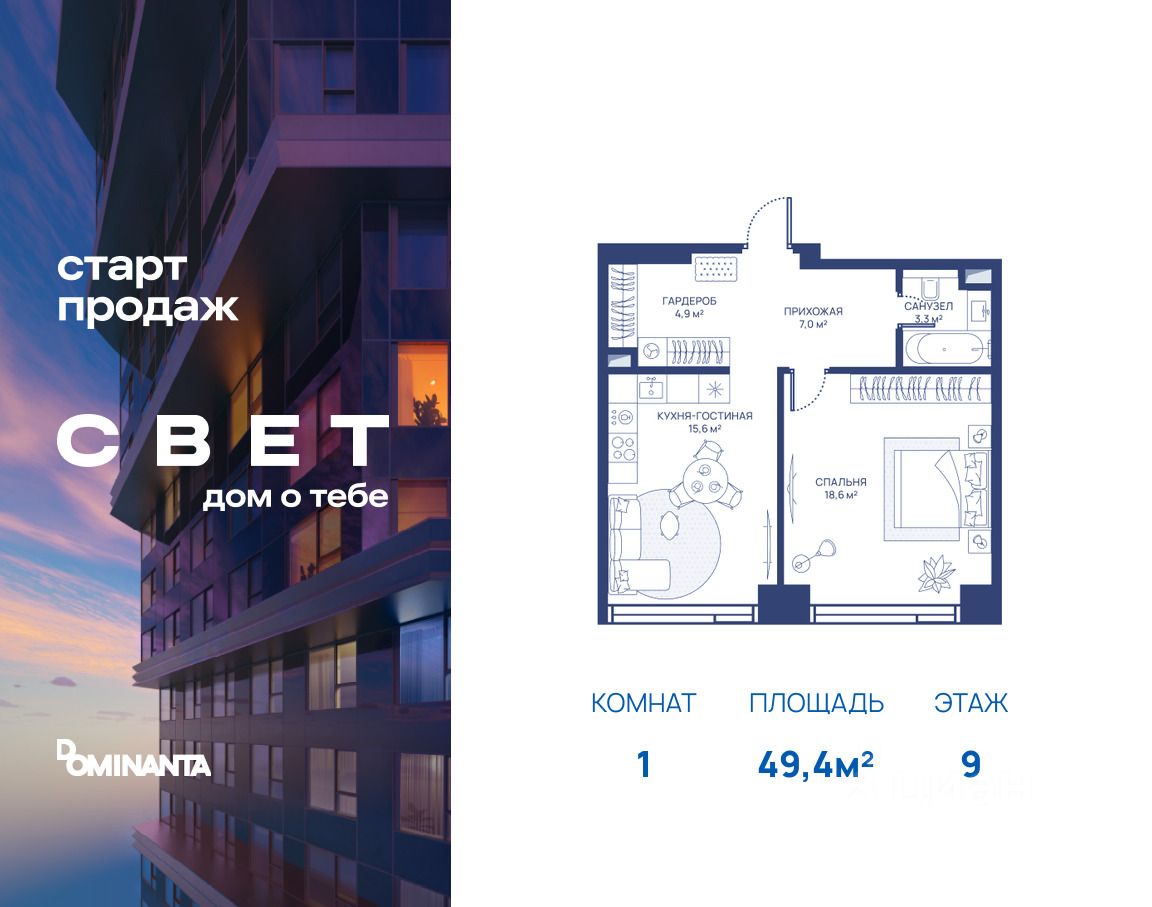 Продаётся 1-к квартира 49.4 кв.м. на 9-м этаже 51 этажного дома.