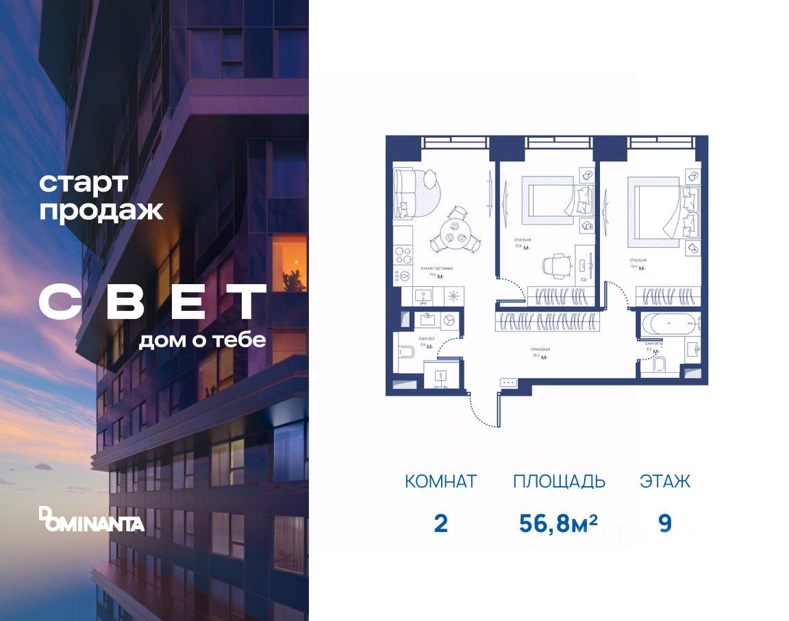 Продаётся 2-к квартира 56.8 кв.м. на 9-м этаже 51 этажного дома.