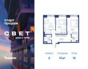 Продаётся 2-к квартира 57 кв.м. на 10-м этаже 51 этажного дома.