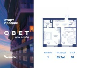 Продаётся 1-к квартира 55.7 кв.м. на 10-м этаже 51 этажного дома.