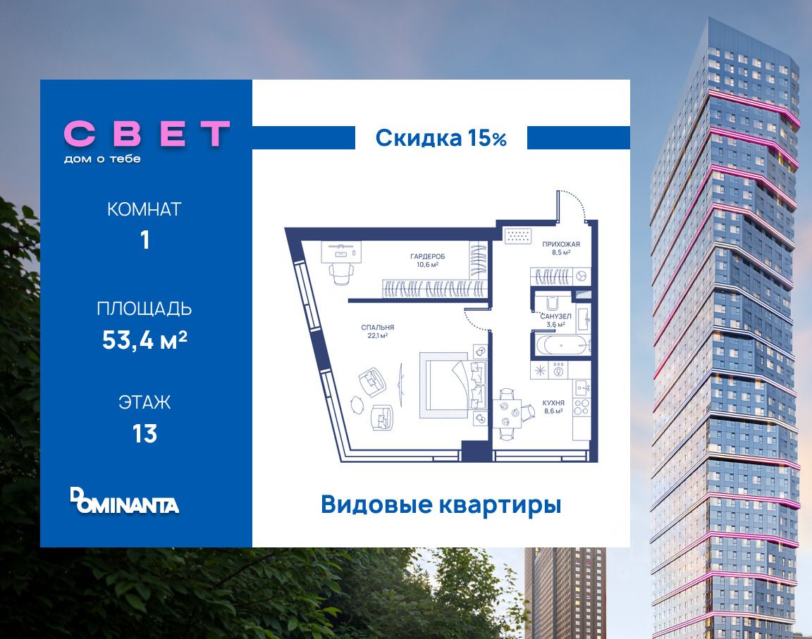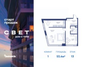 Продаётся 1-к квартира 53.4 кв.м. на 13-м этаже 51 этажного дома.