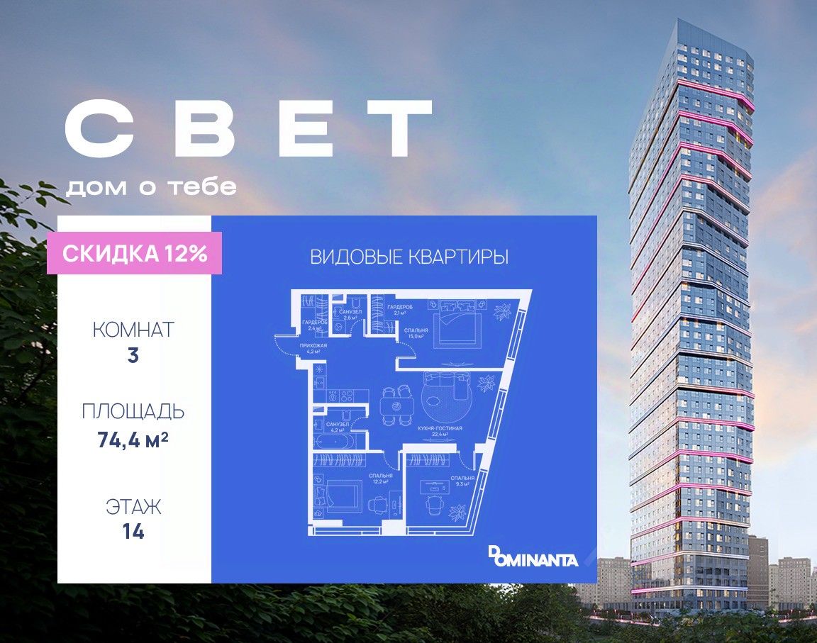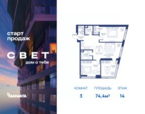 Продаётся 3-к квартира 74.4 кв.м. на 14-м этаже 51 этажного дома.
