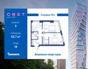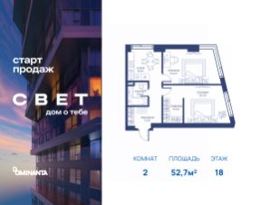 Продаётся 2-к квартира 52.7 кв.м. на 18-м этаже 51 этажного дома.