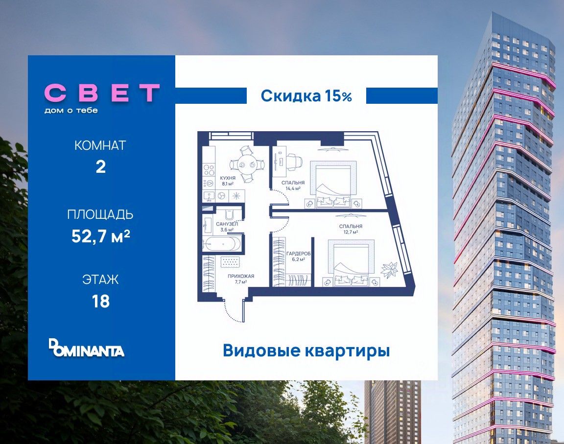 Жилой комплекс "СВЕТ" — воплощение современного комфорта и архитектурного изящества, созданное девелопером Dominanta в сотрудничестве с известным бюро СПИЧ. Комплекс представляет собой элегантное 52-этажное здание, расположенное в Западном Дегунино, на Дмитровском шоссе, 83А. Удачное местоположение обеспечивает удобство для жителей: станция метро "Селигерская" находится в пешей доступности, что делает путь в центр Москвы быстрым и комфортным.