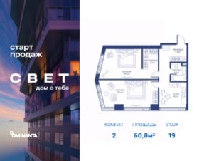 Продаётся 2-к квартира 60.8 кв.м. на 19-м этаже 51 этажного дома.