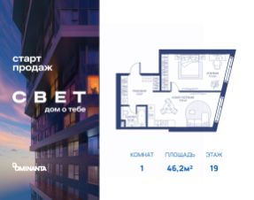 Продаётся 1-к квартира 46.2 кв.м. на 19-м этаже 51 этажного дома.