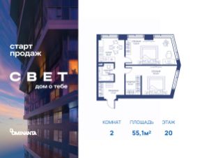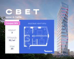 Продаётся 2-к квартира 55.1 кв.м. на 20-м этаже 51 этажного дома.