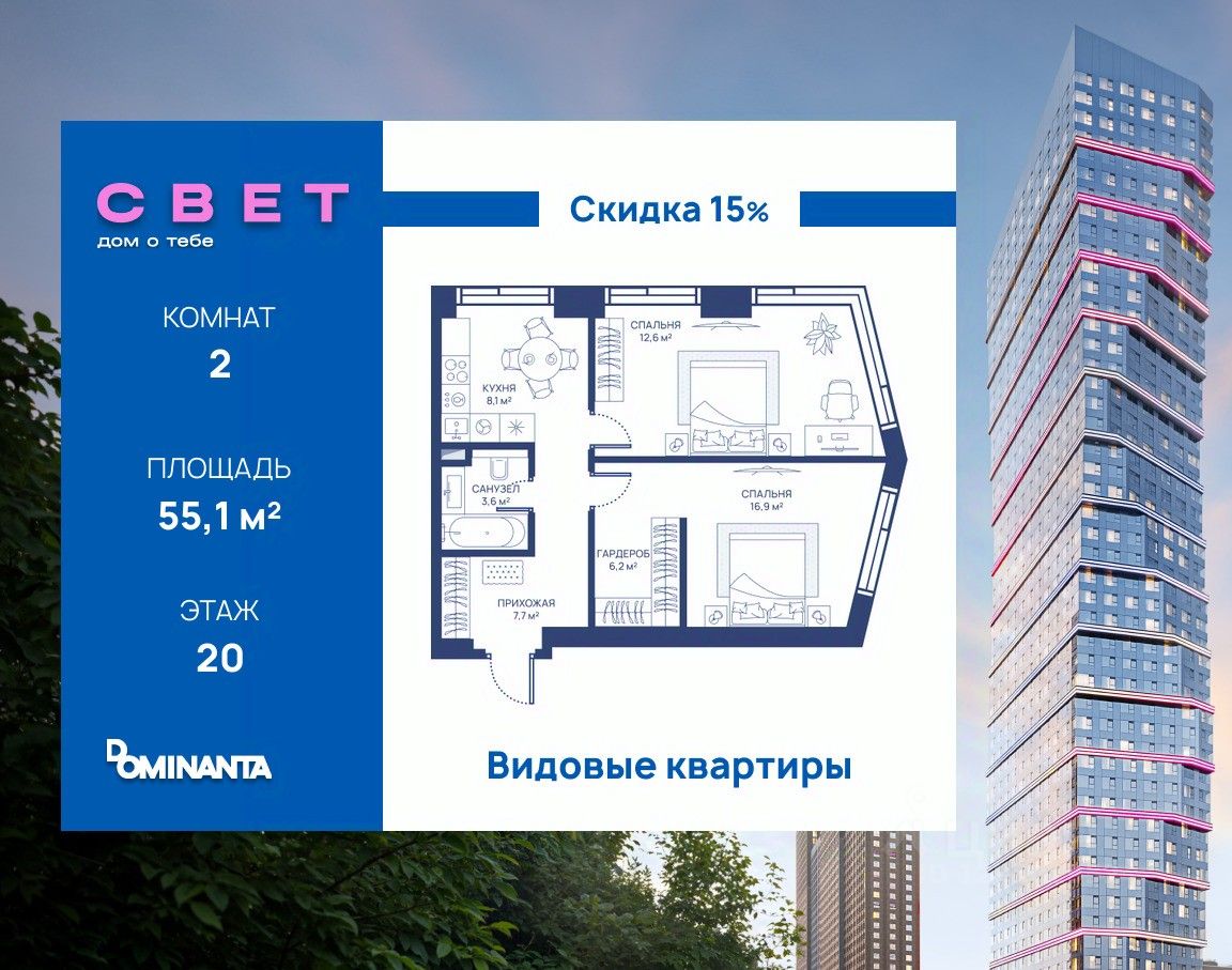 Жилой комплекс "СВЕТ" — воплощение современного комфорта и архитектурного изящества, созданное девелопером Dominanta в сотрудничестве с известным бюро СПИЧ. Комплекс представляет собой элегантное 52-этажное здание, расположенное в Западном Дегунино, на Дмитровском шоссе, 83А. Удачное местоположение обеспечивает удобство для жителей: станция метро "Селигерская" находится в пешей доступности, что делает путь в центр Москвы быстрым и комфортным.