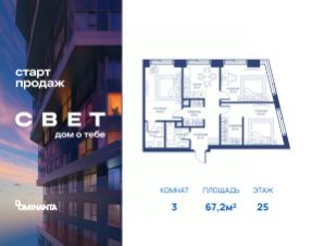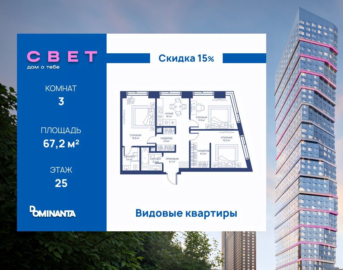Продаётся 3-к квартира 67.2 кв.м. на 25-м этаже 51 этажного дома.