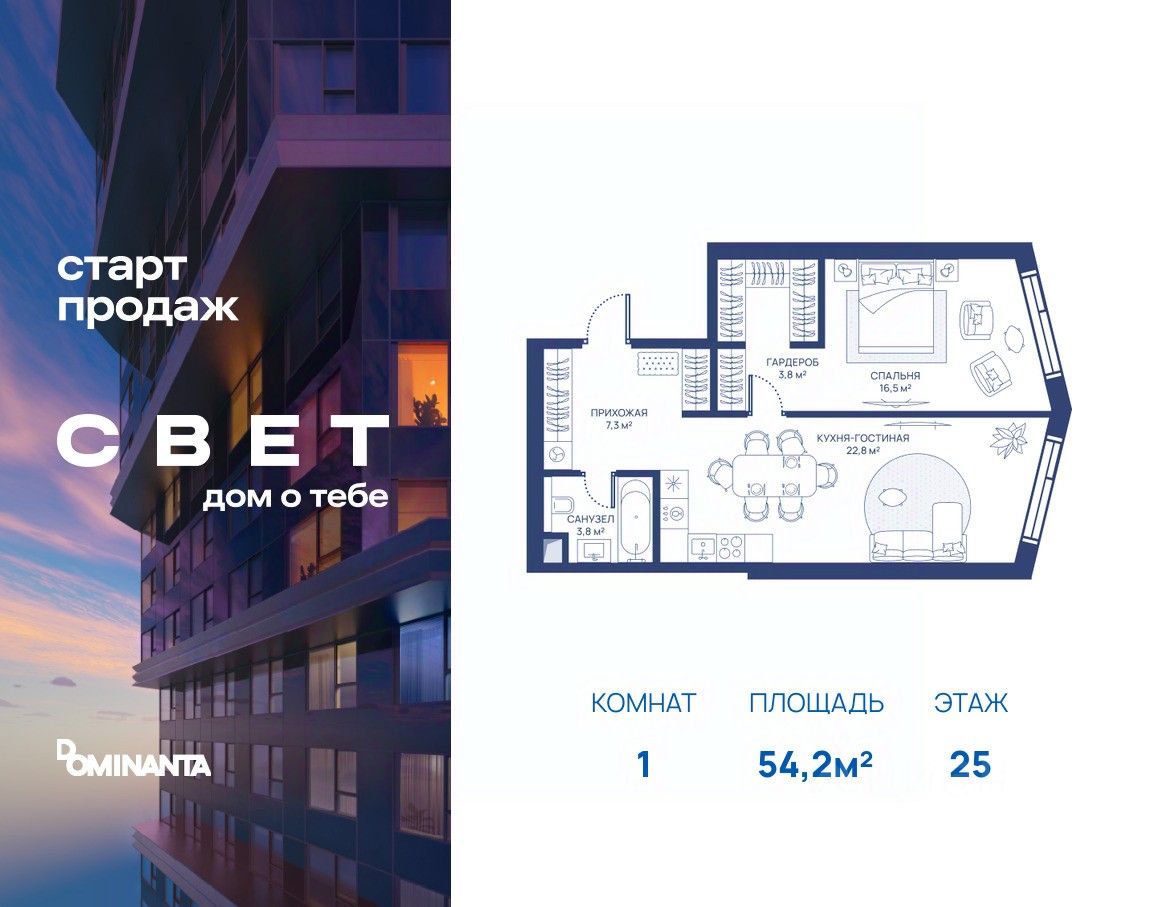 Продаётся 1-к квартира 54.2 кв.м. на 25-м этаже 51 этажного дома.