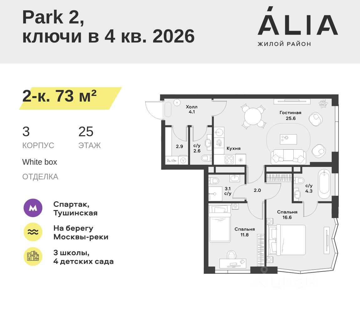 Жилой район ALIA — это дома бизнес-класса у слияния Москвы-реки и Сходни. ALIA находится в Покровском-Стрешневе, экологически чистом районе на престижном северо-западе столицы. Район возводится на бывшей территории Тушинского аэрополя, где никогда не было промышленного производства.
