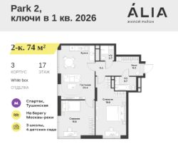Продаётся 2-комнатная квартира 74 м². В жилом районе ALIA на 17-м этаже 28-этажного дома.
