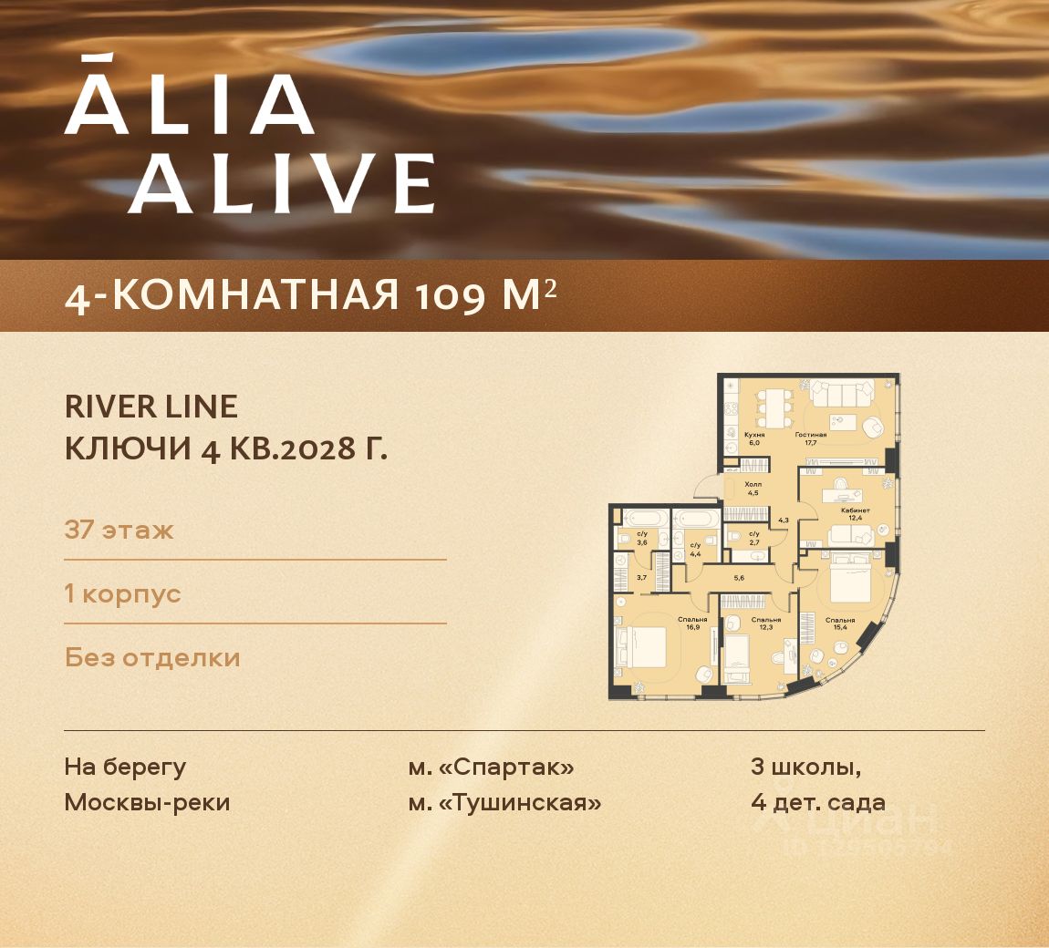 Продаётся 4-комнатная квартира 109 м². В премиальном квартале ALIA ALIVE на 37-м этаже 39-этажного дома.