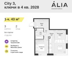 Продаётся 1-комнатная квартира 43 м². В жилом районе ALIA на 2-м этаже 30-этажного дома. Жилой район ALIA — это дома бизнес-класса у слияния Москвы-реки и Сходни. ALIA находится в Покровском-Стрешневе, экологически чистом районе на престижном северо-западе столицы. Район возводится на бывшей территории Тушинского аэрополя, где никогда не было промышленного производства. ALIA — это район разностороннего развития, спроектированный по принципу WORK.LIVE.PLAY.LEARN. Это "15-минутный город", где вся необходимая для комфортной жизни инфраструктура — на расстоянии приятной прогулки. У района удобное расположение: отсюда меньше 10 минут пешком до станций метро "Спартак" и "Тушинская" и всего полчаса на автомобиле до центра города или аэропорта Шереметьево. Архитектурную концепцию ALIA разработало бюро SOM (Skidmore, Owings & Merrill), авторы знаменитой "Бурдж-Халифа". В ALIA больше 140 планировочных решений, среди которых — редкие для Москвы форматы: квартиры с окном в ванной, пентхаус, сити-юниты и таунхаусы. Почти половина территории района отдана под благоустройство. В ALIA три парка: Линейный парк с кафе и магазинами, Центральный парк с амфитеатром, сухим фонтаном и большим плейхабом для детей всех возрастов и Прибрежный парк на собственной набережной, одной из самых длинных в Москве. В каждом урбан-блоке — закрытый внутренний двор с гипоаллергенными растениями и детской площадкой. В лобби каждого жилого корпуса в ALIA оборудована зона ожидания, колясочная, гостевой санузел и лапомойка для домашних животных. За стойкой ресепшена резидентов и их гостей встречает консьерж. Центральное лобби урбан-блока — это стильное общественное пространство с коворкингом, лаундж-зоной и кофе-пойнтом. Это "вторая гостиная" жителей урбан-блока и одно из мест, где формируется комьюнити ALIA. Два ключевых объекта инфраструктуры в ALIA — это спорткомплекс "Чкалов Арена", где представлены 25 видов спорта, и самый большой в стране бизнес-парк класса A, благодаря которому району обеспечено быстрое развитие.