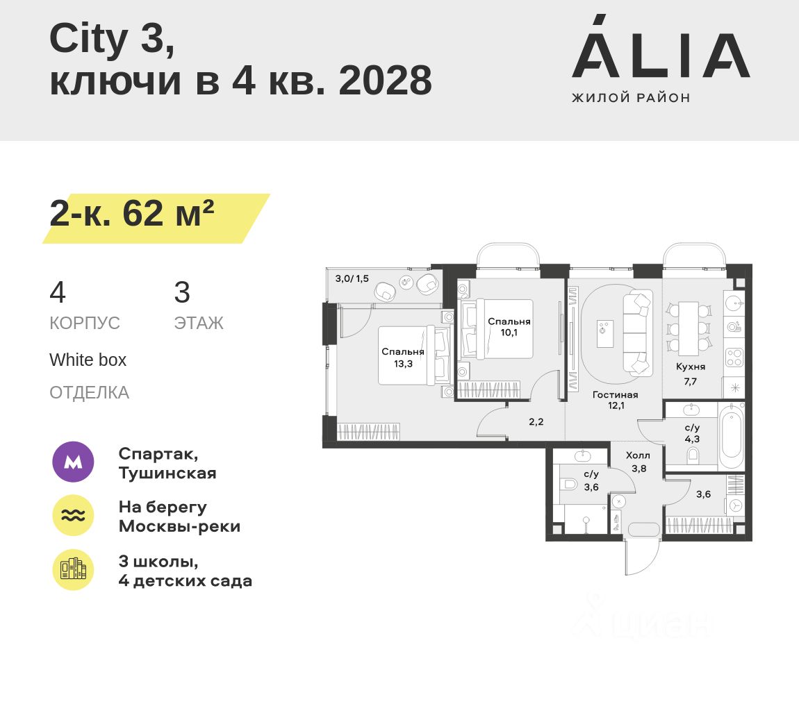 Продаётся 2-комнатная квартира 62 м². В жилом районе ALIA на 3-м этаже 18-этажного дома.