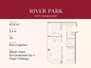 Продается 2-к квартира площадью 60.9 кв.м. на 30-м этаже в жилом комплексе премиум-класса River Park Кутузовский в Башне Amber Tower