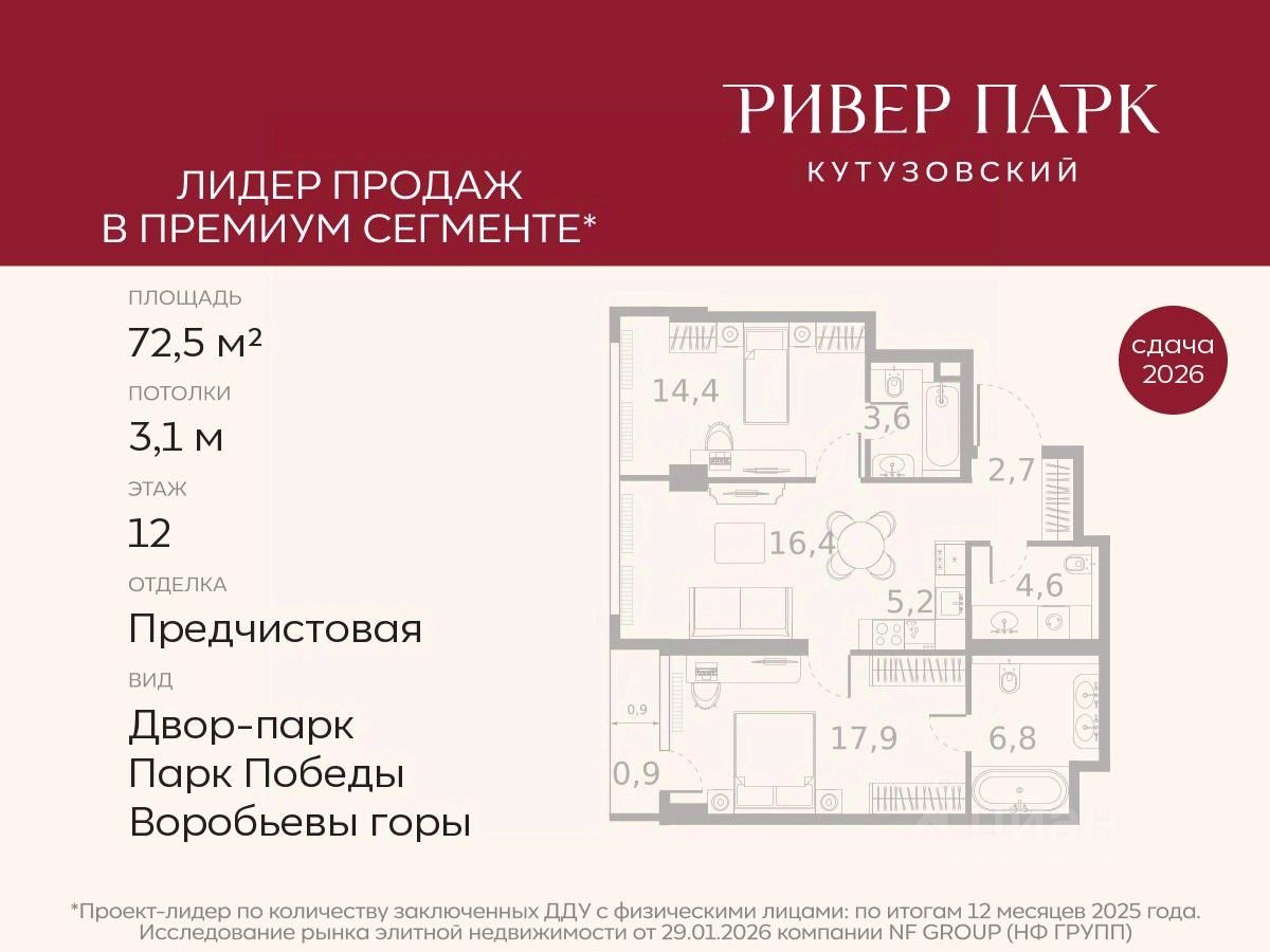 Продается 2-к квартира площадью 72.5 кв.м. на 12-м этаже в жилом комплексе премиум-класса Ривер Парк Кутузовский в Башне Изумруд