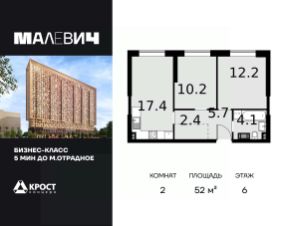 Продаётся 2-к апартаменты 52 кв.м. на 6-м этаже 28 этажного дома.