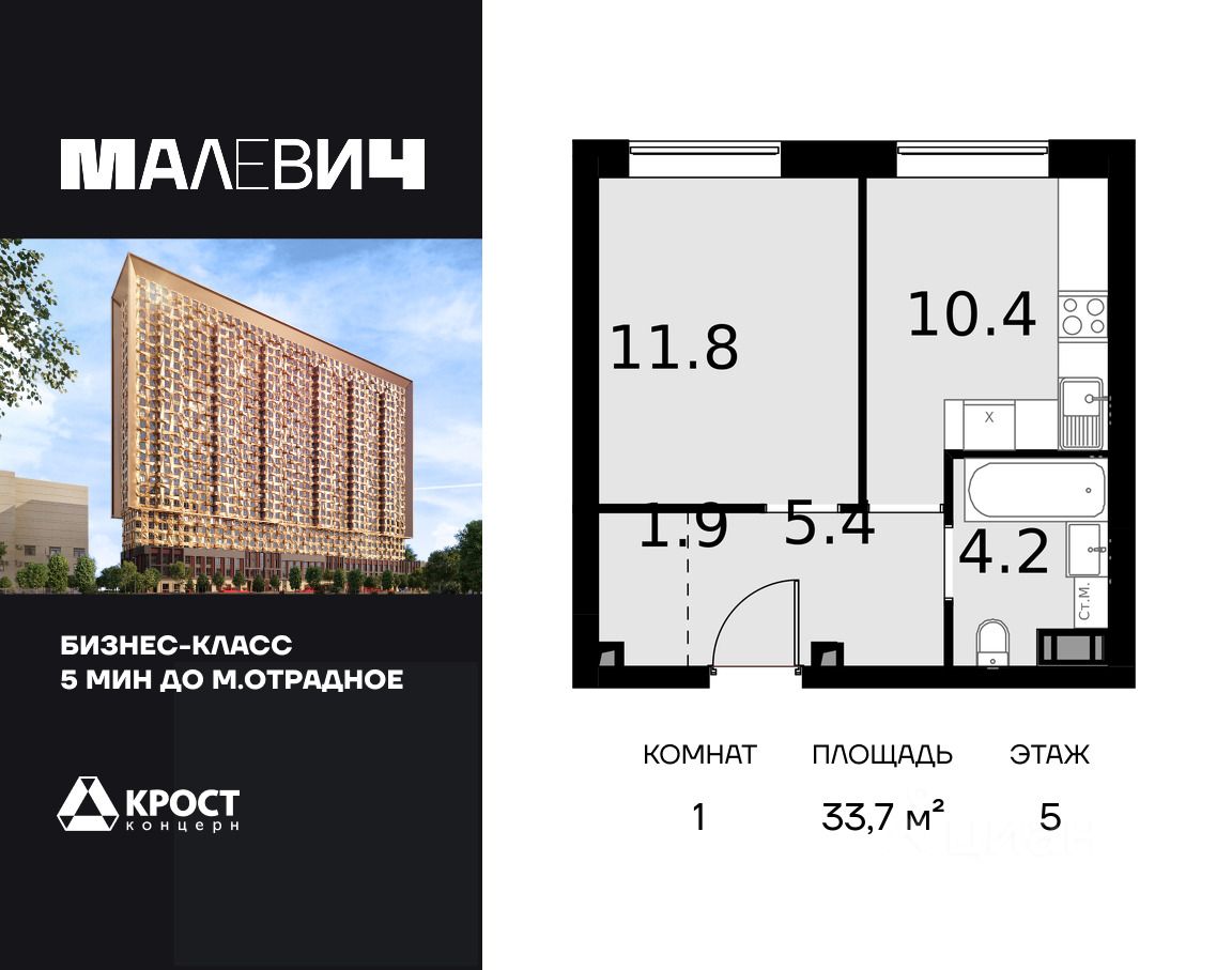 Продаётся 1-к апартаменты 33.7 кв.м. на 5-м этаже 28 этажного дома.