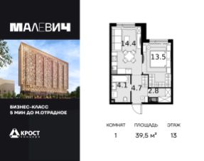 Продаётся 1-к квартира 39.5 кв.м. на 13-м этаже 28 этажного дома.