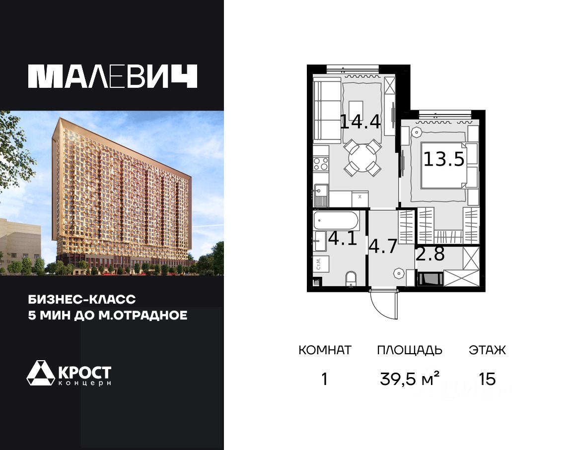 Продаётся 1-к квартира 39.5 кв.м. на 15-м этаже 28 этажного дома.