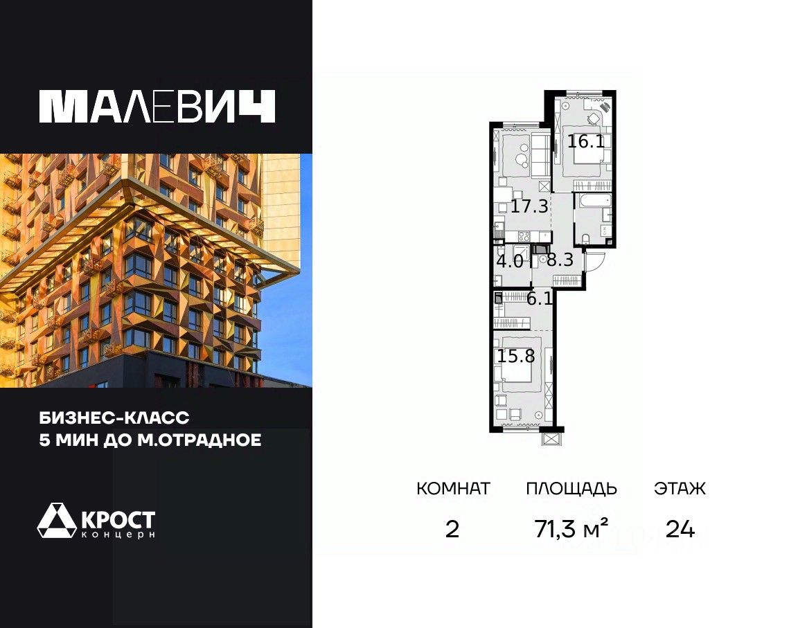 Продаётся 2-к квартира 71.3 кв.м. на 24-м этаже 28 этажного дома.