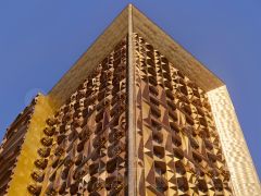 Здание состоит из двух объемов, один из которых сдвинут относительного другого в горизонтальной плоскости.