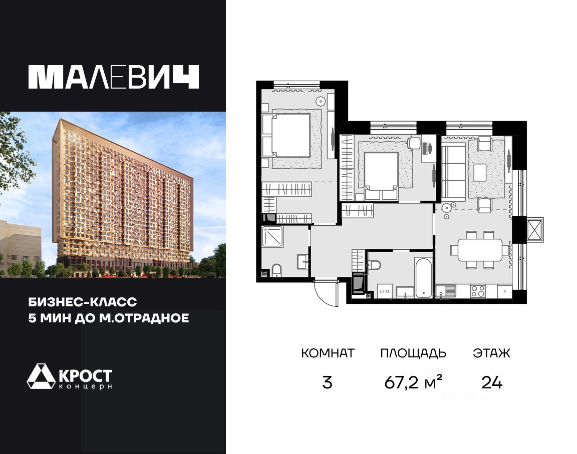 Продаётся 3-к квартира 66.1 кв.м. на 24-м этаже 28 этажного дома.