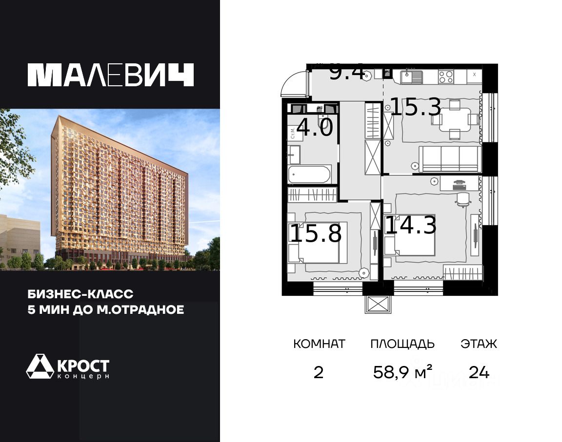 Продаётся 2-к квартира 58.9 кв.м. на 24-м этаже 28 этажного дома.