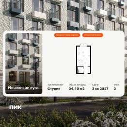 Продаётся квартира-студия площадью 24,4 кв.м на 2 этаже 9 этажного дома (Корпус 4.3, Секция 1) проекта ПИК Ильинские луга. Светлый просторный подъезд на уровне земли, функциональная планировка, большие окна, предчистовая отделка.