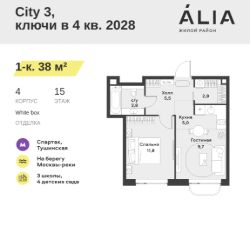 Продаётся 1-комнатная квартира 38 м². В жилом районе ALIA на 15-м этаже 18-этажного дома.