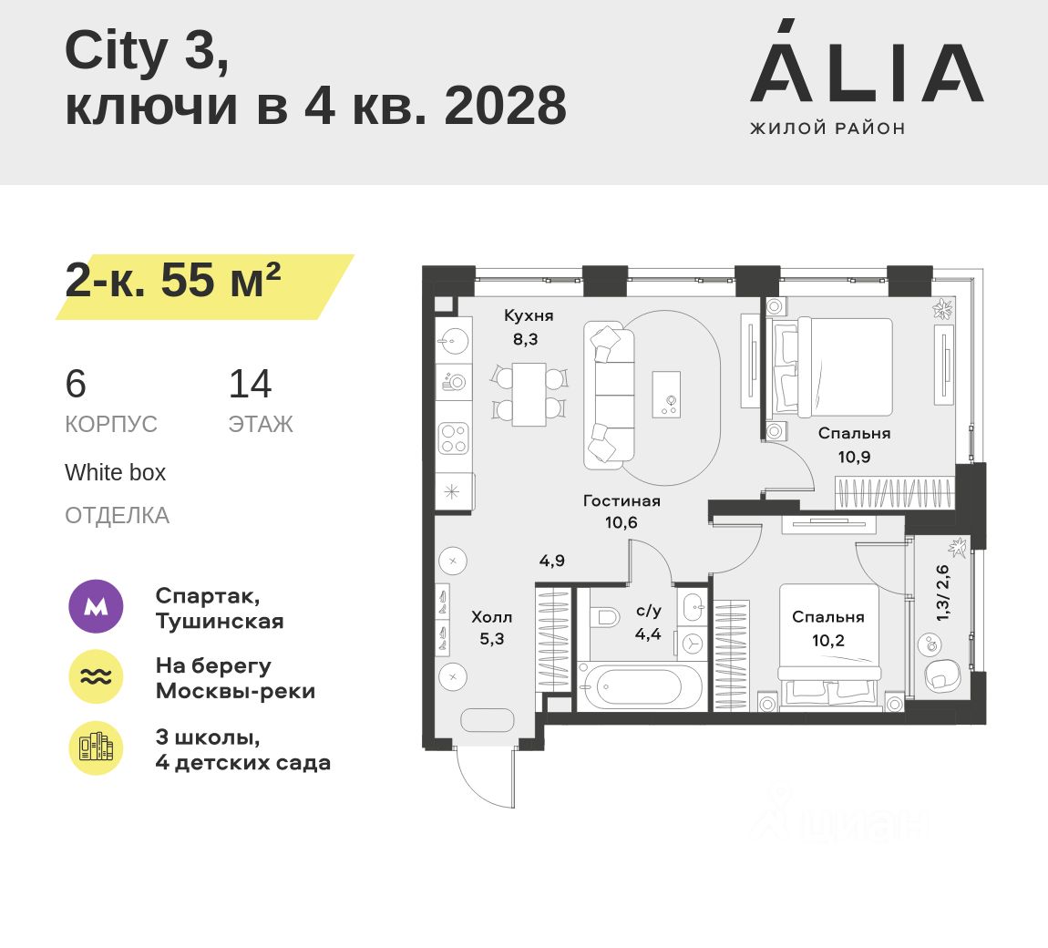 Продаётся 2-комнатная квартира 55 м². В жилом районе ALIA на 14-м этаже 28-этажного дома.