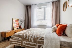 Квартира просторная и светлая, современный стильный интерьер в бежевых тонах с использованием терракотового акцента. Квартира оборудована новой мебелью и техникой, что упрощает и экономит покупателям время для обстановки интерьера.