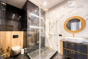 Квартира полностью готова к заселению, меблирована и укомплектована всей необходимой техникой ведущих мировых брендов. Выполнена дизайнерская отделка по индивидуальному дизайн-проекту и с использованием дорогих и качественных материалов из Италии. В квартире теплые полы, а также предусмотрена центральная система вентиляции и кондиционирования — залог комфортной атмосферы в доме.