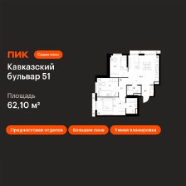 Продаётся 3-комн. квартира площадью 62,1 кв.м на 5 этаже 7 этажного дома (Корпус 3.7, Секция 4) проекта ПИК Кавказский бульвар 51. Светлый просторный подъезд на уровне земли, функциональная планировка, большие окна, предчистовая отделка.