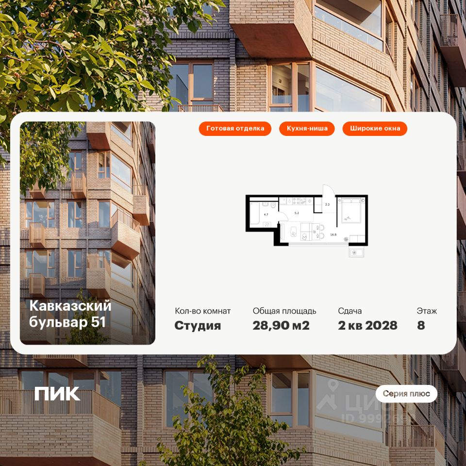 Продаётся квартира-студия площадью 28,9 кв.м на 8 этаже 23 этажного дома (Корпус 3.1, Секция 1) проекта ПИК Кавказский бульвар 51. Светлый просторный подъезд на уровне земли, функциональная планировка, большие окна, c отделкой.