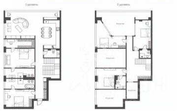 Планировка: 1й уровень: кухня-гостиная с зоной кинотеатра, мастер-спальня с гардеробной и ванной комнатой, спальня с ванной комнатой, гостевой санузел, хозкомната, встроенные шкафы для одежды, балкон во двор комплекса. 2й уровень: 2 детские спальни с ванными комнатами, кабинет.