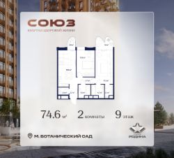 Продаётся 2-комнатная квартира площадью 74.6 м² на 9 этаже в Жилом Комплексе "Союз".