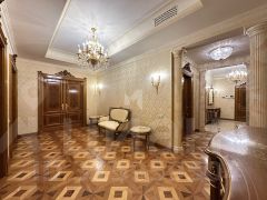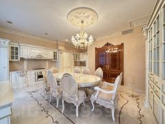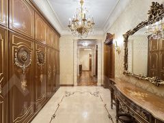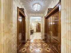 - Классический стиль с элементами современного дизайна: мраморные поверхности, деревянные панели, изящная лепнина и панорамные окна, наполняющие пространство светом.