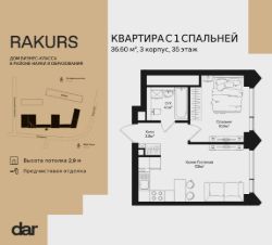 Продаётся 1-комнатная квартира 36.60 м² в жилом комплексе Ракурс. Квартиру отличают панорамное остекление, улучшенная шумо и воздухоизоляция. Дом сдаётся в 1 квартале 2028 года, продажи проходят через эскроусчета. Подземный паркинг, коворкинг, закрытая благоустроенная территория с фонтаном и артобъектами. Гибкие условия покупки.