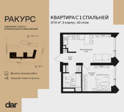 Продаётся 1-комнатная квартира 37.10 м² в жилом комплексе Ракурс. Квартиру отличают панорамное остекление, улучшенная шумо и воздухоизоляция. Дом сдаётся в 1 квартале 2028 года, продажи проходят через эскроусчета. Подземный паркинг, коворкинг, закрытая благоустроенная территория с фонтаном и артобъектами. Гибкие условия покупки.