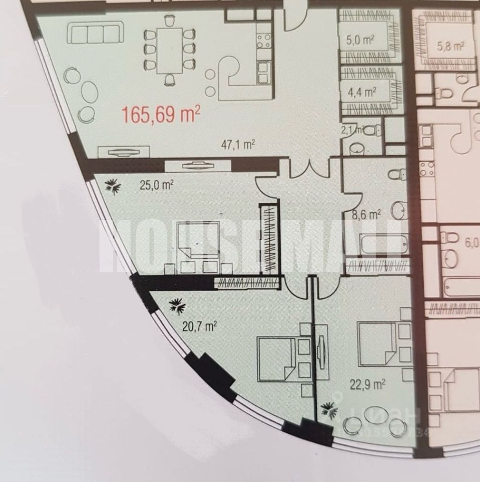 Это квартира общей площадью 165 м², находящаяся в ЖК Триколор, квартира может похвастаться своими видовыми характеристиками.